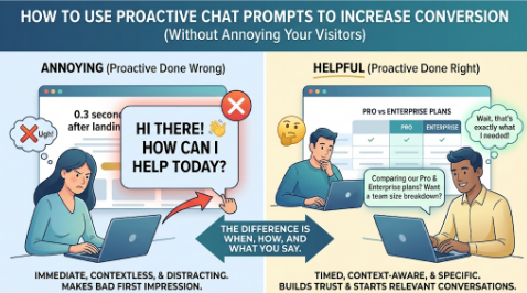 Won’t proactive chat annoy visitors? Only if done wrong. Too early, too generic, too aggressive — yes, annoying. Timed right, contextual, genuinely helpful — visitors appreciate it. 68% of customers view proactive chat positively when it’s relevant.