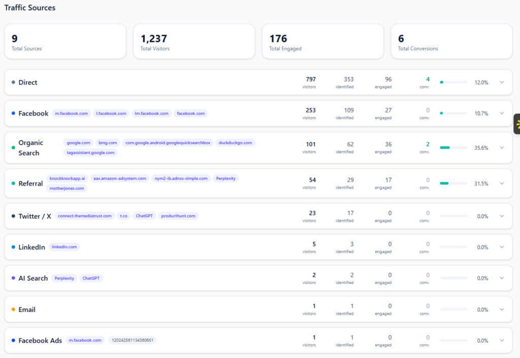 | Source | Visitors | Identified | Engaged | Converted | Rate |