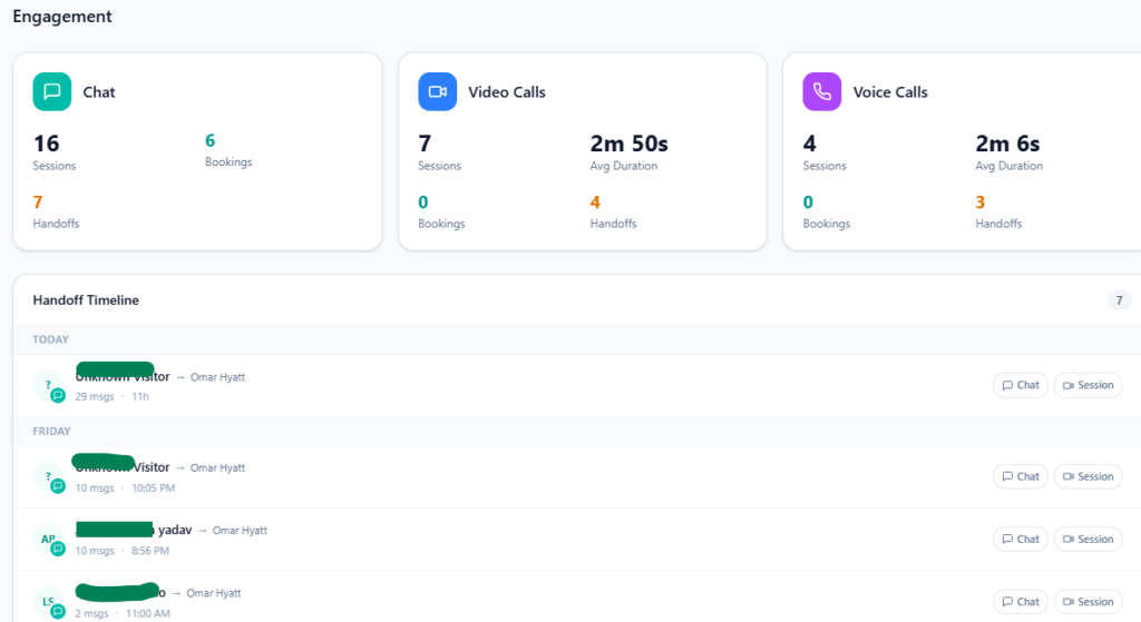 You see: – Total sessions per channel – Bookings generated – Handoffs to human reps – Average call duration