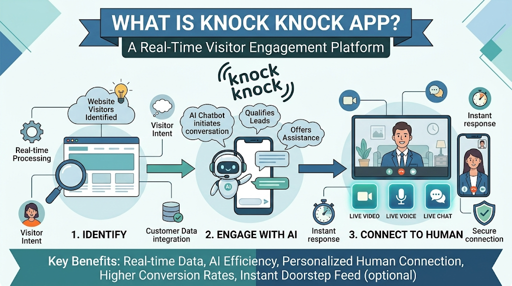 Knock Knock App is a real-time visitor engagement platform. It identifies website visitors, engages them with AI, and connects them to humans via live video, voice, or chat.