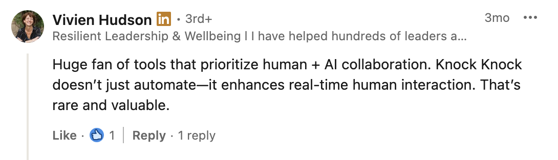 Traditional chatbots & Voice Agents feel robotic and frustrate users. Knock Knock’s AI is transparent, helpful, and genuinely useful. Plus, it seamlessly hands off to humans via voice or video when needed – no awkward transfers.